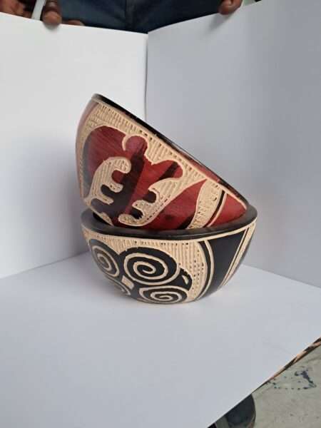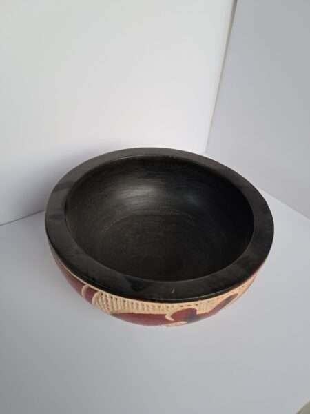 Wooden Bowl carved with intricate adinkra symbols and colorful patterns. size 8inches diameter. it can be stand alone or be paired with a stand to sit on sold separately.